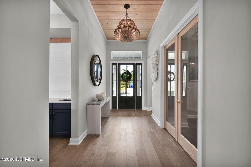 Listing details for 30 Windmill Palm Trl, Ponte Vedra, FL 32081 : This 6BR/4BA Grand Acadia in Palmetto Cove at Nocatee features recently completed designer upgrades throughout. The home offers soaring ceilings with wood beams, wide-plank hardwoods, plantation shutters, and designer lighting. Interior highlights include three fireplaces with oversized mantels, shiplap accents, and built-ins with granite counters. Gourmet kitchen features double islands, stacked cabinetry, and an entertainer's bar with seating, wine refrigerator, and sink. Primary suite includes a spa bath with freestanding tub and frameless glass shower. Attached casita/mother-in-law suite includes kitchenette and full bath, with private entrance through the summer kitchen. Outdoor living: screened lanai with summer kitchen, two outdoor fireplaces incl. 16+ ft brick feature, porcelain pavers, extended patio, pergolas, epoxy finished 3-car garage (2 bays), and a large fenced corner lot with privacy landscaping and room for a pool.
