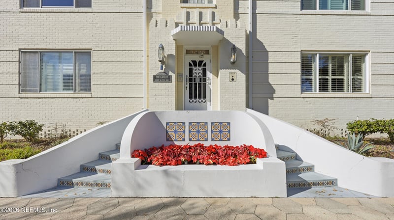 Listing details for 3225 St Johns Ave #B, Jacksonville, FL 32205 : Rare opportunity in the original Avondale Historic District—where condos are scarce and first-floor residences with 2 bedrooms and 2 bathrooms are even rarer. This beautifully renovated home is located in the iconic Art Deco Kahler Condo, designed by renowned architect Henry John Klutho, whose signature craftsmanship is evident throughout, from the original door hardware to the elegant lighting and extensive moldings. Hardwood floors and plantation shutters run throughout the unit. The spacious living and dining rooms are filled with natural light from large, double-pane windows, creating a bright and inviting atmosphere. The renovated kitchen features new cabinetry, granite countertops, stainless steel appliances, open shelving, and opens directly to the rear entry courtyard and garage parking. Additional highlights include common storage in the basement and under the stairs. The hall bathroom showcases original vintage tile, while the primary bathroom has been tastefully modernized. Major updates include a 2022 electrical panel, and 2022 roof. This wonderful home offers exceptional walkability, historic character, and modern comfort. The unit may be sold fully furnished, allowing for a seamless transition into your new residence. New since purchased electric induction convection range, stacked ventless washer/dryer, tankless water heater, new duct work, and 2 new ceiling fans.