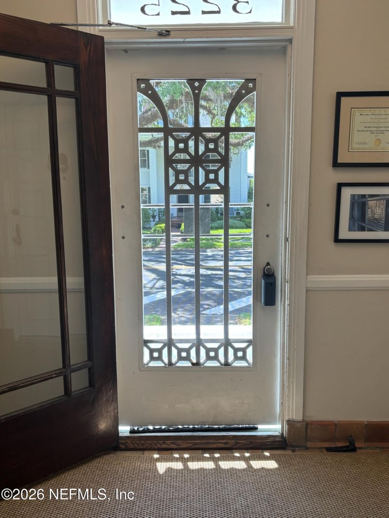 Listing details for 3225 St Johns Ave #B, Jacksonville, FL 32205 : Rare opportunity in the original Avondale Historic District, where condos are scarce and first-floor residences with two bedrooms and two bathrooms are even rarer. This beautifully renovated home is located in the iconic Art Deco Kahler Condominium, designed by renowned architect Henry John Klutho. His signature craftsmanship is evident throughout—from the original door hardware to elegant lighting and extensive moldings. Hardwood floors and plantation shutters run throughout the unit. The spacious living and dining rooms are filled with natural light from large double-pane windows, creating a bright and inviting atmosphere. The renovated kitchen features new cabinetry, granite countertops, stainless steel appliances, open shelving, and opens directly to the rear entry courtyard with convenient garage parking. Closet space in this home is truly impressive. Each bedroom closet has been thoughtfully redesigned for optimal organization, accommodating approximately 80-118 pieces clothing. The primary bath features a 5-foot-deep closet ideal for longer or bulkier items, and the guest bath includes a full linen closet for additional storage. A rare bonus, the main foyer offers a key-locked storage closet complete with a rolling four-shelf cart and ample room for a bicycleperfect for seasonal décor, luggage, or personal belongings. The hall bathroom showcases original vintage tile, while the primary bathroom has been tastefully modernized. Major updates include a 2022 electrical panel and roof, new ductwork, tankless water heater, electric induction convection range, stacked ventless washer and dryer, and new ceiling fans. Additional highlights include common storage in the basement and under the stairs. This wonderful home offers exceptional walkability, historic character, and modern comfort. The unit may be sold fully furnished, allowing for a seamless transition into your new residence.