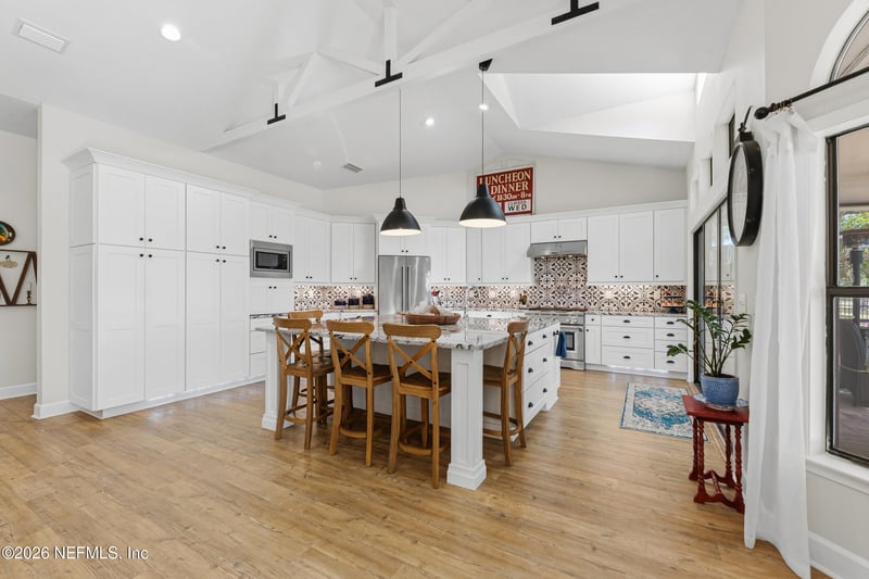 Listing details for 3309 Sequoyah Cir, Jacksonville, FL 32259 : Designer-remodeled golf course home with stunning views of the 7th and 8th fairways, located in highly desirable St. Johns County with A-rated schools. This beautifully updated 4-bedroom, 3-bath home offers 2,630 square feet of light-filled living space with high ceilings throughout and exposed beams enhancing the open-concept design. The gourmet kitchen features a large entertaining island, 36-inch gas range with pot filler. The spacious primary suite includes dual walk-in closets, an oversized shower with dual shower heads, and an additional flex room ideal for an office, nursery, or fitness space. Full 2017 renovation included complete replumbing and tankless water heater installation. Exterior living is designed for entertaining with a screened lanai with a summer kitchen and outdoor firepit. Agents-PLEASE SEE THE ATTACHED FEATURE SHEET! TOO MANY TO LIST. *Seller is a licensed real estate agent in the State of Florida and is the listing agent for this property