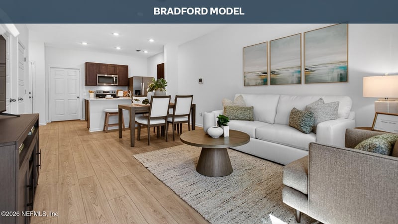 Listing details for 336 Counsel St, Yulee, FL 32097 : The Bradford townhome is a thoughtfully planned design that makes exceptional use of its approximately 1,167 square feet, offering a comfortable and efficient layout with two bedrooms and 2.5 bathrooms. This charming two-story home welcomes you with an open and connected main living area where the kitchen, dining space, and gathering room flow together to create an inviting setting for everyday living. The kitchen is designed with generous counter space and a functional layout that makes cooking and entertaining both easy and enjoyable. Just beyond the living room, the covered front porch provides a relaxing outdoor extension of the home, perfect for enjoying warm summer evenings or starting the day with a quiet cup of coffee. Upstairs, the primary suite serves as a private retreat with a spacious walk-in closet and a well-appointed bathroom featuring a large vanity. The second bedroom offers its own attached bathroom and a walk-in closet.
