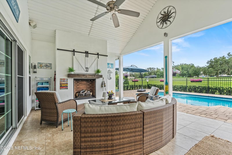Listing details for 3410 Shinnecock Ln, Green Cove Springs, FL 32043 : Imagine living in this stunning 2016 custom-built pool home, designed for both entertaining & comfortable everyday living. The double-door entry reveals a magnificent great room with soaring vaulted ceilings, effortlessly connecting to a gourmet kitchen and dining area - perfect for gatherings. Chefs will delight in the expansive center island, stainless appliances, gas cooktop, & double wall ovens. Retreat to one of two spacious primary suites on the main level, each a private haven with its own bath & walk-in closet; the main suite offers a luxurious bath & an immense walk-in closet. Rich hardwood floors throughout the main floor, complemented by a cozy gas fireplace. Upstairs, a guest suite plus an enormous bonus room (doubles as a 4th bedroom), adaptable to any need. The outdoor oasis beckons with a vaulted, covered patio, complete with a TV, gas fireplace, & a sparkling saltwater pool. In-ground sprinklers & new solar panels for energy savings. So much to love about this home! Enjoy the tranquility of pond and golf course views from your fenced backyard. This home is as practical as it is beautiful, featuring energy-saving solar panels, a three-car garage with ample parking, generous storage, and a functional laundry room. As a unique, custom-built residence and one of the newest in the community, this home offers an exceptional lifestyle. There's more yard space than what is currently fenced. See the survey.