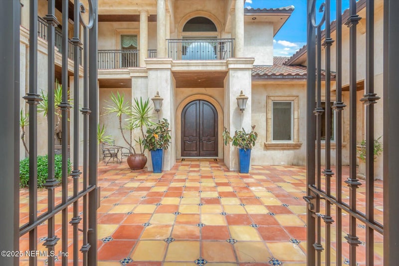 Listing details for 3533 Crest St, St Augustine, FL 32092 : Welcome to 3533 Crest Street, a distinguished Mediterranean enclave nestled within the prestigious Crest section of King & Bear in World Golf Village. Masterfully constructed with solid concrete block and terracotta tile roof, this 8,113 square foot residence exudes timeless elegance, architectural integrity, and curated craftsmanship throughout. Perfectly positioned on the legendary 15th green with stunning waterfront and preserve views. Beyond the gated courtyard entry, framed by mature landscaping and hand-laid Spanish tile, a sense of grandeur and warmth unfolds. Through 12-foot double doors, you're welcomed into a home where old-world character meets refined luxury—featuring 20+ foot ceilings, hand-selected finishes such as Travertine and wide-plank wood flooring, alongside antique European architectural elements, including a castle-salvaged bathroom door and reclaimed church doors leading to the office. The main level flows effortlessly for both daily living and grand entertaining. A formal dining room is serviced by a full butler's pantry with warming drawers and a conditioned step down wine cellar. A chef's kitchen boasts granite countertops, gas range, copper farmhouse sink, dishwasher drawers, and a walk-in pantry equipped with dual Subzero refrigerators and custom shelving. The adjacent breakfast nook, encased in mitered glass, frames panoramic views of the infinity-edge pool, tranquil lake, and the iconic 15th hole of the King & Bear golf course. The primary suite on the first floor is a private retreat with direct pool access, dual custom walk-in closets professionally adorned with built-ins, and a spa-inspired bath with a centered jetted soaking tub, oversized walk-in shower, and refined finishes. Additional first-floor highlights include a guest room ensuite, a pool bath, a private office, and a fully outfitted 500sf home gym with rubber flooring and wall mirrors. A custom wrought iron staircase leads to a second living room with a full-length balcony and a wet bar, ideal for evening entertaining. The living area doubles as a theater room, complete with immersive surround sound. A private bedroom wing includes two guest bedrooms, a shared bath, flex area with built-in bookcases and another private balcony. A secondary staircase provides access to a secluded guest suite complete with its own kitchenette and sitting area, perfect for extended family or live-in guests. Versatile 600 sq ft private office includes a full bath, storage, and potential as an in-law suite. Enjoy Florida's year-round beauty with a covered summer kitchen, outdoor fireplace, and lounge areas surrounding the stunning infinity-edge pool. The expansive motor court includes a 4-car tandem garage, 2-car side-entry garage, golf cart bay, and a custom dog grooming stationblending convenience with thoughtful luxury. Built with solid block construction and a concrete tile roof, this home is as enduring as it is elegant. A whole-house generator adds security. As a resident of King & Bear, enjoy resort-style amenities: a championship golf course co-designed by Arnold Palmer and Jack Nicklaus, multiple pools, fitness center, tennis and pickleball courts, trails, playgrounds, a dining clubhouse, and the Circles of Wellness Spa. Welcome home.