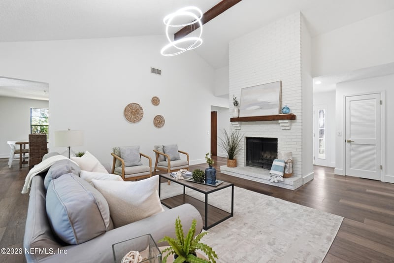 Listing details for 355 19th St, Atlantic Beach, FL 32233 : Welcome to your coastal sanctuary at 355 19th Street in the heart of Atlantic Beach. Travel down a beautiful canopy road, and you are greeted by a charming single-story bungalow. The curb appeal sets the stage for a relaxed lifestyle just a short, five-minute stroll from the sand and surf. Step inside to discover gorgeous hardwood floors and a spectacular great room featuring soaring cathedral ceilings and a wood-burning fireplace. The open layout flows seamlessly into a large, open, and spacious kitchen designed for gathering and entertaining. This beautiful culinary space is highlighted by a convenient center island, freshly painted kitchen cabinets, a classic farm sink, a 6-burner gas stove with double oven, and sleek black stainless steel appliances. Just off the main living area is an inviting enclosed porch, providing the perfect bonus room to utilize as a home office or a playroom. Down the hall, both bathrooms have been tastefully updated with modern finishes. Spend your coastal evenings entertaining on the back deck or unwinding in your very own hot tub beneath the stars. The backyard is fully fenced and includes an outdoor shower as well as a 2-car garage. A gem of a home in Atlantic Beach.