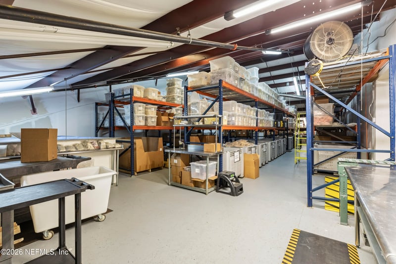 Listing details for 3653 Regent Blvd #605 AND 606, Jacksonville, FL 32224 : **END UNIT WAREHOUSE**DOUBLE UNIT**LOADING DOCK** This versatile commercial warehouse is a double end unit with 2 entrances, located in a small gated and fenced/secured, quiet and safe subdivision. The block building and FULLY INSULATED structure features 2 overhead drive-in doors 10'x 12' and a tall ceiling height from 16' to 22' span. With 4,800 sq ft ground space and an additional mezzanine of 3,000 sq ft--including stairs and pallet access--this space offers a total of 7,800 sq ft. It is FOOD GRADE INSPECTED and includes a 576 sq ft full wash down room with HOT WATER and additional water lines throughout the warehouse. The facility offers FULL AC WITH 2 NEW UNITS UNDER WARRANTY, plus 2 wall exhaust fans and skylights. Power is abundant with 3 phase/220v/110v and many additional outlets. The property includes a RENOVATED OFFICE 784 sq ft office, 1 BATHROOM, and a mop/sink room. Next to truck level loading dock which allows further space for staging shipments, it is close to