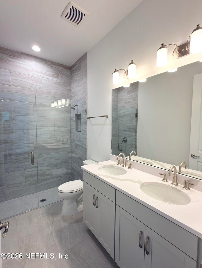 Listing details for 37 Callaway Cir, St Johns, FL 32259 : NEW TOLL BROTHERS HOME! Move in this Mar/Apr 2026! Discover this beautifully upgraded single‑story home tucked along a quiet road ending in a cul‑de‑sac and surrounded by wooded preserve in a private, gated community with no CDD fees. The interior features a modern, cool‑toned palette with luxury vinyl plank flooring in Heatherstone Grey and a stunning two‑toned kitchen—light cream perimeter cabinetry paired with a smoky chocolate island. Quartz countertops with dramatic grey veining, brushed nickel hardware, a modern stainless steel farmhouse sink, and a gourmet appliance package elevate the space. Large sliding glass doors open to an oversized covered lanai with a gas line ready for your grill. The primary bath impresses with a massive dual‑head Kohler shower finished in a tasteful blend of beiges and greys for a clean, modern contrast. Schedule an appointment to tour our model home and see this incredible homesite for yourself.