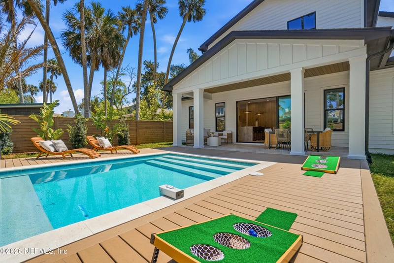 Listing details for 371 9th St, Atlantic Beach, FL 32233 : Welcome to this newly completed coastal modern residence in the heart of coveted Atlantic Beach. Just a short walk to the ocean and Atlantic Beach Town Center, you are steps from local dining, shopping, and the best of beach living. Situated on a generous 58x130 lot, this three story home offers 4,151 square feet of thoughtfully designed living space. With 5 bedrooms and 4 bathrooms, the layout balances function and flexibility. The primary suite and a secondary bedroom with ensuite bath are conveniently located on the first floor, along with a dedicated laundry room. The open concept living area is designed for everyday comfort and entertaining, featuring a gas linear fireplace, custom built ins, and a floating window bench seat. The kitchen makes a statement with a Taj Mahal leathered quartzite waterfall island, elevated cabinetry and tile selections, and a hidden scullery for seamless prep and storage. Upstairs, the second floor includes three additional bedrooms, a second laundry room, and a versatile sitting area ideal for an office, media space, or homework zone. The third floor loft and balcony create an inviting retreat for entertaining or unwinding. Engineered hardwood flooring runs throughout, complemented by smooth level 5 ceilings for a clean, modern finish. Elevated lighting selections from Visual Comfort and Hudson Valley add warmth and sophistication. Additional highlights include an epoxy coated garage floor and whole home water filtration system. The backyard is built for Florida living, complete with a private pool and space to gather. Enjoy an easy stroll to Jack Russell Park and nearby Hannah Park with miles of trails and outdoor recreation. A rare opportunity to own a custom new construction home in one of Atlantic Beach's most sought after locations.
