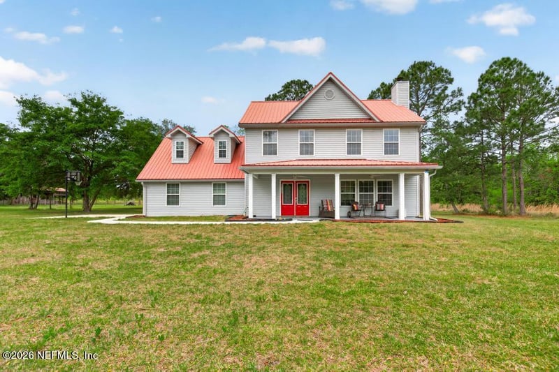 Listing details for 391200 Prospect Landing Rd, Hilliard, FL 32046 : Escape the ordinary and embrace country living with this charming two-story farmhouse nestled on an expansive 12.22 acres in Hilliard. You are greeted with a covered front porch that welcomes you home with peaceful views. Step inside and explore this 2040 sq ft home with a generous open living room and a wood-burning fireplace that flows seamlessly into the dining area. The main level also features convenient under-stair storage, a half bath, a dedicated laundry room, and an attached two-car garage for all the practical necessities of daily life. Upstairs features the primary bedroom with a walk in closet. Primary bath has double sinks, a stand alone tub, and a separate shower. Two additional bedrooms and a large bonus room with endless possibilities. Two HVAC units to cool the upstairs and downstairs. Outside, the majority of land is cleared and equipped with fencing, making it ideal for horses, livestock, or simply stretching out under wide-open skies.16x24 Pole Barn. Close to the St. Mary's boat ramp and State forest. With locally rated schools nearby, this property delivers the rare combination of space, serenity, and convenience. Schedule your private tour today.