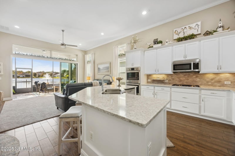 Listing details for 396 Sargasso St, Fernandina Beach, FL 32034 : Pride of ownership shines throughout this 3BR/2.5BA home with lakefront views located within the desirable Dunes of Amelia community located ON Amelia Island and a short drive to the Atlantic ocean and Fernandina Beach's downtown historic district. This stunning single-story residence offers an inviting open-concept living and kitchen area featuring quartz countertops, a gas double oven with separate gas cooktop, stainless steel Bosch appliances, under and above cabinet lighting, and a spacious island perfect for entertaining. The ample dining room size accommodates the whole family and provides plenty of entertaining room. Wood-look plank tile flows seamlessly throughout the main living spaces and bedrooms, complementing the freshly painted interior and exterior. Other recent updates include modern light fixtures, bathroom faucets, a stylish new fireplace surround, and updated landscaping on the exterior that enhances the home's curb appeal. The versatile laundry room has been upgraded with an oversized stainless sink, countertop, and added cabinetry for storage. Located in a natural gas community, the home includes a tankless water heater, gas dryer hookup, and an exterior gas line ready for your grill. Enjoy Florida living at its finest with a screened lanai and extended paver patio overlooking peaceful lake frontageideal for taking in beautiful sunsets and watching local wildlife. Move-in ready and thoughtfully upgraded, this home combines comfort, style, and scenic outdoor living.