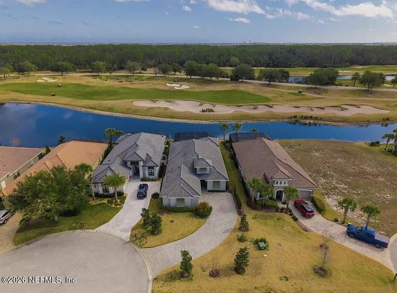 Listing details for 401 Bourganville Dr, Palm Coast, FL 32137 : This 4/3.5 home offers soaring ceilings with natural light via retractable sliding glass doors opening to a private oasis with serene lake, golf course, and preserve views. The open-concept design centers on a gourmet kitchen with KitchenAid appliances, quartz counters, custom tile backsplash, coffee station, wet bar with beverage fridge, and walk-in pantry. The family room has stone accent wall with linear fireplace. Outdoors, enjoy an oversized lanai with hurricane-rated retractable screen, summer kitchen and expansive saltwater pool overlooking unobstructed lake and golf vistas. Highlights include an 800-bottle refrigerated wine room, a flexible office/ 4th bedroom, primary suite with lake views, spa-like bath with heated floors, two guest bedrooms, California Closets, whole-house Sonos audio, and dedicated pool bath.