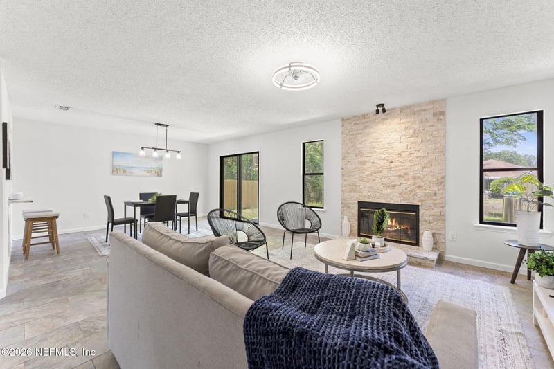 Listing details for 4047 Laurelwood Dr, Jacksonville, FL 32257 : WELCOME HOME--your opportunity to own a NEWLY RENOVATED 3-bedroom, 2.5-bath end-unit townhome in Mandarin for under $300K! Step inside to a warm and inviting living area featuring a cozy wood-burning fireplace, perfect for cold winter nights. This open concept is perfect for hosting and entertaining family and friends. A convenient half bath is located downstairs for guests. The bright, updated kitchen consists of new cabinetry, countertops, stainless steel appliances, a stylish patterned backsplash, and a breakfast bar! The adjoining dining area is filled with natural light from a large sliding glass door, offering seamless flow for everyday living. Upstairs, you'll find all bedrooms, including a spacious primary suite. The additional bedrooms share a bathroom with dual wooden vanity and tub-shower combo. Enjoy the backyard patio overlooking a peaceful pond and shaded backyard! You do not want to miss out! Schedule your showing today, this one won't last long.