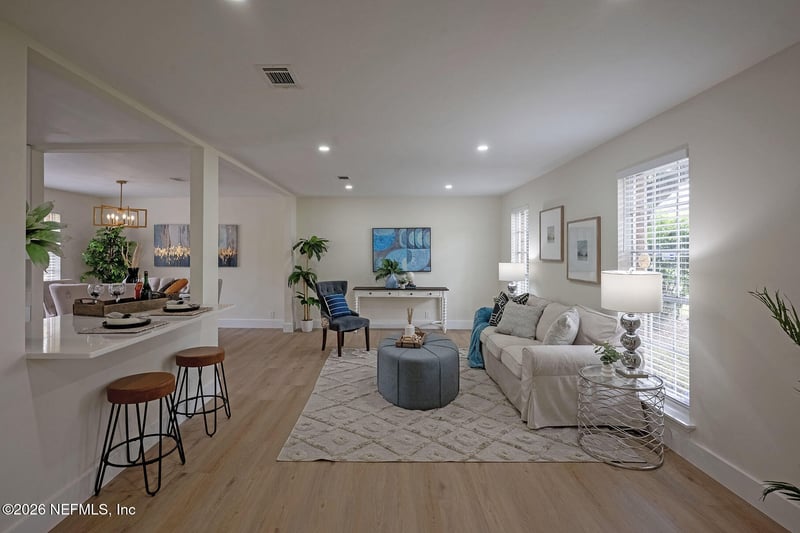 Listing details for 4061 Heath Rd, Jacksonville, FL 32277 : **FULLY RENOVATED**NO HOA**LARGE LOT**NEWER ROOF** Welcome to this MOVE-IN READY, split-level gem! This renovated, 4 bed/2.5 bath home sits on a LARGE LOT with NO HOA, featuring a HUGE FENCED BACKYARD and a charming barn. You'll find a long driveway and oversized 2 car garage for ample parking. Inside, the OPEN CONCEPT layout is modern and cozy, showcasing woodlike LVP throughout and 2 LIVING ROOM SPACES. The home is FRESHLY PAINTED and boasts thoughtfully curated finishes like stylish lighting fixtures and gold accents. The kitchen boasts sleek white cabinetry with gold hardware, a breakfast bar, and stainless steel appliances. All bathrooms feature floor to ceiling tile. Major updates provide peace of mind, including a NEWER ROOF (2024) and UPDATED HVAC (2019). Located in a quiet neighborhood with gorgeous mature trees, you are just 2 mins away from the Lonnie Wurn Boat Ramp with public access to a community BOAT LAUNCH and parks. Don't miss this!