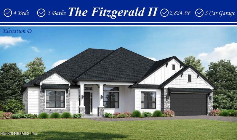 Listing details for 416 Sandy Bluff Dr #0057, Yulee, FL 32097 : NEW COMMUNITY! Sandy Bluff features a gated entrance, community riverfront boardwalk, pickleball court, dog park, trails & more! The Fitzgerald, one of SEDA's most popular floorplans, features 2,827 sq. ft. and has 4 bedrooms, 3 baths, and a study. This gorgeous open-concept plan has an abundance of natural light with the dining room, gathering room, kitchen and breakfast area all open to each other. The gourmet kitchen has a 36'' cooktop, oven tower, large dine- in island, pendant lights and walk-in pantry. Double-step tray ceilings create a dramatic 12-14 ft ceiling height in the foyer, dining room, and gathering room. The covered lanai can be accessed through large sliding glass doors creating a great indoor/ outdoor entertaining space. The owner's bath has a luxurious walk-in shower, double vanities and separate Water Closet. This rendering is a conceptual drawing only and is not meant to represent the actual exterior colors. Builder reserves the right to modify.