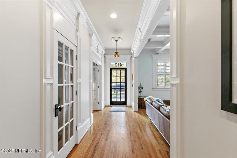 Listing details for 419 6th St, Jacksonville, FL 32206 : This well-appointed Craftsman style 2 story bungalow features a 1st floor master suite & versatile flex space. Built in 2003 by SRG as an amended Greeley plan with over 2800 sq ft of living space. Gleaming hardwood floors and extensive custom woodwork, 10 ft ceilings, including coffered ceilings in the living & dining rooms, tall built-in shelving with glass fronts, & columns, oversized baseboards, dining room wainscoting with plate rails, & detailed custom trim around each doorway. There are plantation shutters throughout. The natural gas fireplace in the living room is as easy to use as flipping a switch. In addition, the main level offers three bedrooms, including a spacious master suite with walk-in closet fitted with premium California-style built-ins, one with French doors, & two full baths. The master bath features both a tub & shower. Upstairs, there are two guest bedrooms (slightly different from the floor plan), a full bath, & family room. Additional amenities include a back deck and fully fenced yard. This five-bedroom, three-bathroom home sits on a wide, deep lot and includes a two-car garage with additional storage above, suitable for conversion into a studio apartment or playroom. The property boasts a koi pond and thoughtfully landscaped front and back yards featuring native plants.