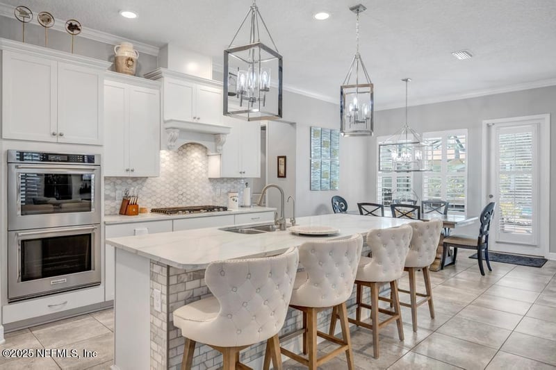 Listing details for 43 Pine Manor Dr, Jacksonville, FL 32081 : Live the Nocatee lifestyle in this stunning pool home in Timberland Ridge! Tucked away on a quiet cul-de-sac surrounded by peaceful lakes, this 4-bedroom, 3.5-bath home feels like your own private retreat. From the moment you walk in, you'll notice the thoughtful design and high-end details that make this Providence home stand out, such as 10-foot ceilings, crown molding, designer light fixtures, wainscoting in the dining room, and plantation shutters on every window. The gourmet kitchen is a dream come true for anyone who loves to cook or entertain, featuring quartz countertops, a marble backsplash, a large island with a marble-tiled base, soft-close cabinetry wired for under-cabinet lighting, and a walk-in pantry with custom details, and all new KitchenAid appliances. It flows beautifully into the spacious family room, where a custom accent wall, built-in fireplace, and wine rack create the perfect cozy gathering space. Upstairs, you'll find four oversized bedrooms, all with walk-in closets, plus a loft-style family room and a convenient laundry area. The primary suite offers two walk-in closets, a spa-like bathroom with pocket doors, and a separate shower for a peaceful retreat at the end of the day. But the real showstopper is outside. Step into your own private resort! A huge screened lanai with an outdoor kitchen, brand new epoxy flooring, 6-person hot tub, pergola with fan and electric, and a saltwater pool with a sundeck, two waterfall fire bowls, and a heater/chiller system. Mature landscaping adds privacy, so you can truly unwind in your backyard paradise. Even the garage is impressive! A 3-car setup with storage systems and a Tesla charger. One bay has been converted into a climate-controlled game room with barn doors, offering a perfect hangout space or hobby area. And when you're ready to venture out, Nocatee offers everything right at your fingertips. Golf cart to Publix, the Farmer's Market, Food Truck Fridays, Beer & Bingo nights. With world-class amenities including pools, waterparks, tennis, pickleball, playgrounds, and dog parks, you'll see why Newsweek named Nocatee the Best Place to Live in Florida four years running. Come experience it for yourself! This isn't just a home, it's a lifestyle.