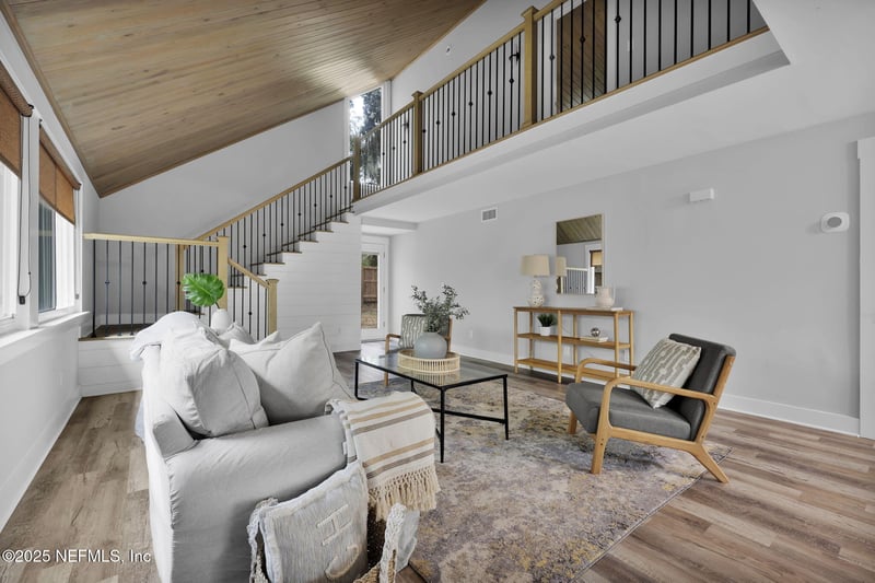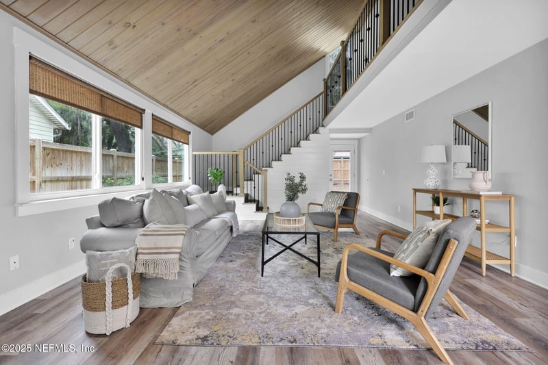 Listing details for 431 19th St, Jacksonville Beach, FL 32250 : Tucked away on a quiet street, this coastal home boasts standout curb appeal with mature oak trees, expansive windows, and unobstructed marsh views. Inside, tongue-and-groove vaulted ceilings, two inviting seating areas, exposed brick stairs, and thoughtful architectural details create a warm, stylish vibe. Luxury vinyl plank flooring, quartz countertops, stainless steel appliances, and a dedicated laundry room add everyday comfort and convenience. Outside, enjoy a fenced-in backyard, expanded driveway, and new backyard patio—perfect for relaxing or entertaining. Fully updated in 2020, the home also features recently added windows and plantation shutters. The property is all within easy biking distance to Jacksonville Beach's best parks and restaurants.