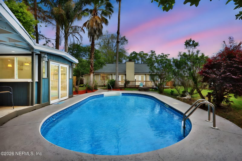 Listing details for 4340 Queensway Dr, Jacksonville, FL 32257 : Indoor-Outdoor living at its best! This property offers a rare combination of indoor and outdoor entertainment spaces, anchored by a sparkling, heated pool, tree-lined backyard, deck, and covered patio. A detached flex structure with brand new windows and a sliding glass door adds more versatility - perfect for a home office, studio, or poolside retreat. Inside, the garage has been transformed into a home theater - a bonus space for movie nights, unforgettable game-day experiences or a private guest retreat. Major system upgrades, including newer roof (Nov 2023), HVAC (2025), GUTTERS (2025), offer peace of mind and reduced maintenance for years to come. Entertain and relax all in one place. Enjoy your morning coffee on the deck overlooking the water, or a glass of wine next to the fire pit. Ideally located within walking distance to local restaurants, schools, and grocery stores, this home has it all! Ask about the Lender Incentive available with use of preferred lender.