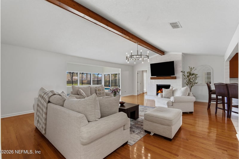 Listing details for 4414 Gentle Knoll Dr, Jacksonville, FL 32258 : Stunningly Renovated Pool Home with Lake Views in Mandarin Welcome to your dream oasis at 4414 Gentle Knoll Dr N! This beautifully renovated home offers the perfect blend of modern luxury and serene living in the heart of Mandarin. Step inside to discover an inviting open floor plan featuring gleaming wood floors, soaring vaulted ceilings with rustic exposed beams, and a stylish fireplace that serves as the heart of the living space. The chef-inspired kitchen is a showstopper, boasting rich custom cabinetry, granite countertops, a sleek modern range hood, and a convenient breakfast bar perfect for casual dining. Designed for relaxation and entertaining, the spacious Florida room offers panoramic views of the backyard, flooding the space with natural light. Step outside to your own private retreat featuring a sparkling screened-in pool overlooking a tranquil lake, surrounded by lush landscaping. The primary suite offers a touch of elegance with a spa-like ensuite bath, complete with a frameless glass shower, custom niche, and backlit vanity mirror. With 4 full bedrooms you have options for guest rooms, office space, playroom and more! Practical updates include a 2018 roof and 2019 AC, ensuring peace of mind for years to come. With a dedicated laundry room offering ample storage and a fresh, modern exterior, this home is move-in ready. Schedule your private tour today!