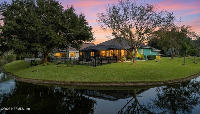 Listing details for 4581 Comanche Trail Blvd, St Johns, FL 32259 : Enjoy breathtaking water views from your backyard — a true highlight of this property. Whether it's sunrise reflections across the water or sunset serenity settling over the trees, this tranquil setting offers unmatched privacy and natural beauty. These views aren't just picturesque - they're a lifestyle upgrade. This beautifully maintained 3-bedroom, 2-bath home with a dining room, cafe area, flex space and an additional office/flex room is located in the gated Cimarrone Golf and Country Club community and features a sparkling screened in solar heated pool overlooking the peaceful water. Inside, the home impresses with quartz kitchen countertops, a stylish backsplash, stainless steel appliances, a modern sink and faucet, updated lighting, fresh interior paint, and new windows throughout. Other improvements include a 2022 roof and HVAC, water softener and reverse osmosis system, gutters, pool motor and salt cell, multi color pool light, pool screen enclosure, painted deck and porch, fencing and refreshed landscaping - offering true move in confidence. Residents enjoy exceptional amenities including a resort style pool, clubhouse, fitness center, pickleball & tennis courts, basketball courts, and a playground. The community also surrounds a beautifully maintained 18-hole, par 72 championship golf course known for its scenic water features and engaging layout. After a round of golf, or a day of relaxing at the pool, unwind at Stone & Barrel Taphouse with casual dining, a beautiful backdrop, trivia nights, and live music  all just minutes from your front door. This home seamlessly combines thoughtful upgrades with serene waterfront living in one of St. Johns' most sought after communities. No CDD! Opportunities like this don't come often. Don't let this be the one that got away.