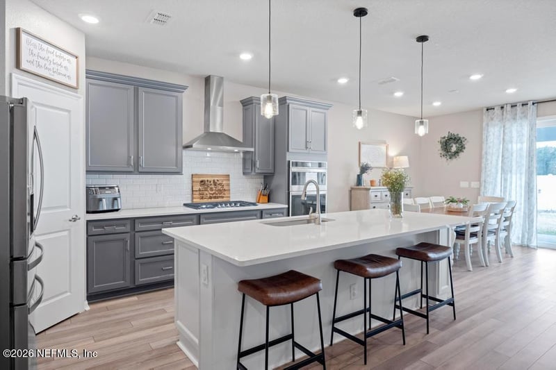 Listing details for 4648 Farmhouse Gate Trl, Jacksonville, FL 32226 : Welcome to this beautiful 5-bedroom, 3-bath home built in 2022 and perfectly situated on a corner lot. The thoughtful floor plan offers the primary suite and an additional bedroom on the main level, ideal for guests or a home office. Upstairs features spacious secondary bedrooms, including 2 rooms with large walk-in closets. The light and airy open-concept living space features a large kitchen island overlooking the dining and family room—perfect for entertaining and everyday living. Enjoy the fully fenced backyard offering privacy and space to relax or play. A 3-car garage provides ample room for vehicles and storage. Conveniently located just minutes to Interstate 295 for easy commuting and a short drive for shopping, dinning, and running errands. This community also provides a kid park and a nature trail to a kayak launch on to Clapboard creek.