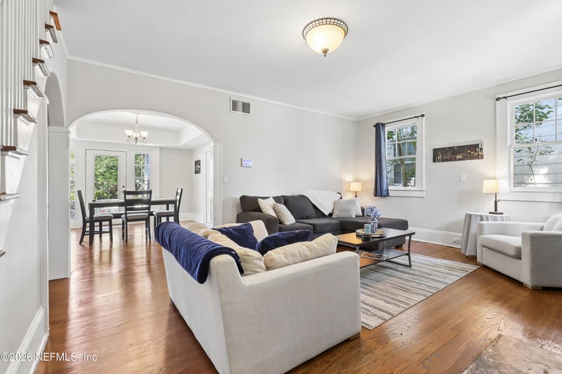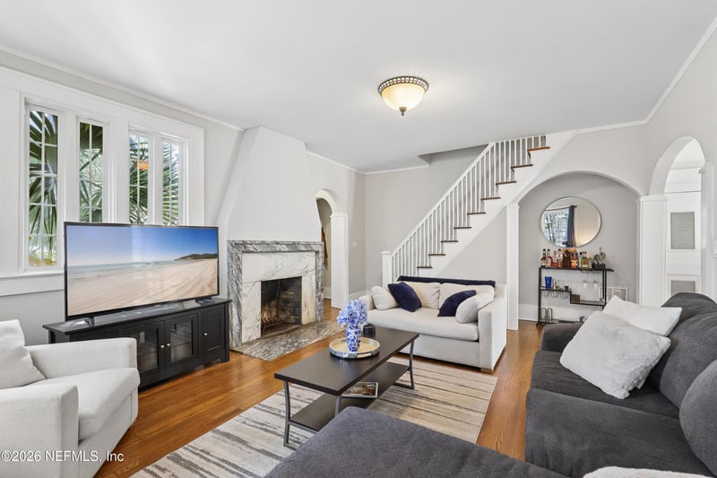 Listing details for 4949 Fremont St, Jacksonville, FL 32210 : Charming 1926 historic home in Lakeshore! This light-filled gem features beautiful wood floors, classic arched doorways, and an open living room with a marble fireplace. Enjoy a spacious dining room and a cozy breakfast nook with built-in benches. Two bedrooms are located downstairs, with an upstairs retreat featuring a clawfoot tub. Detached garage offers great space for storage or hobbies and a fully fenced in backyard. Full of character and timeless appeal!