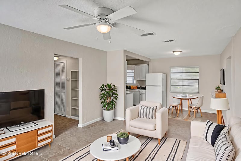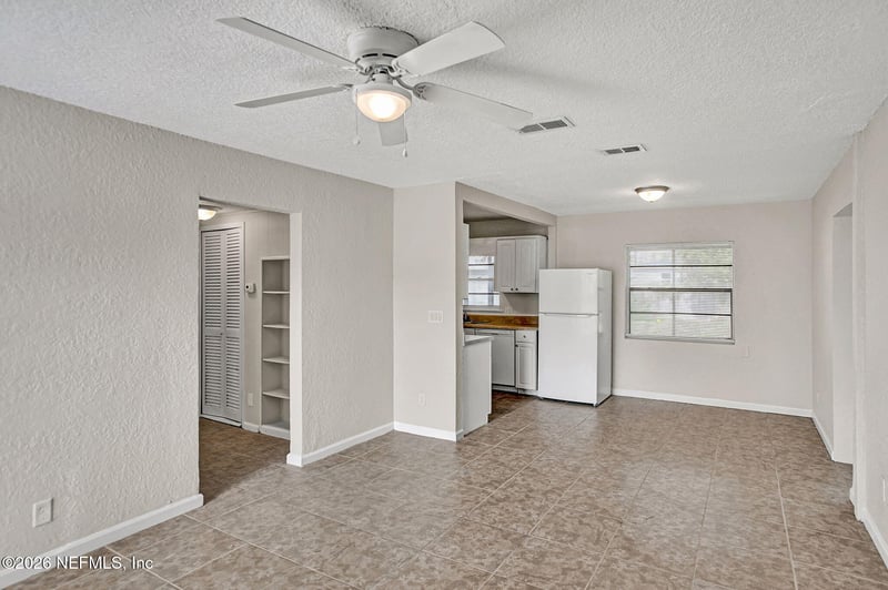 Listing details for 5235 Lexington Ave, Jacksonville, FL 32210 : Freshly refurbished and full of charm, this cute and cozy 3-bedroom, 1-bath home offers comfort, versatility, and inviting style. A bonus room provides flexible space—perfect for a home office, playroom, or additional living area. The home features a freshly painted interior and exterior, updated light fixtures, ceiling fans, and mini blinds throughout, creating a bright and welcoming atmosphere. The neatly tucked-away kitchen adds a delightful pop of character with white cabinetry, a window above the sink overlooking the patio and backyard, and appliances that include a refrigerator, stove, and dishwasher. Tile flooring enhances the main living areas, while newly installed carpet in the bedrooms adds warmth and comfort. Outside, enjoy a nicely sized screened patio and a fully fenced backyard, ideal for relaxing or entertaining. The detached garage provides additional storage space. Conveniently located near Jacksonville Naval Air Station. Schedule a tour today!