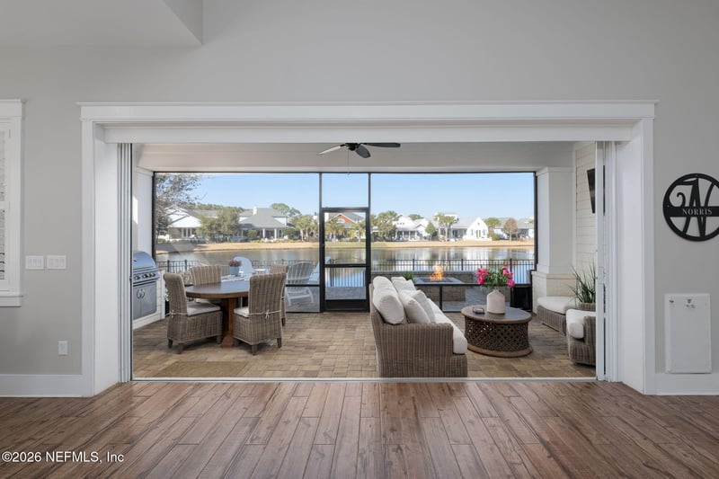 Listing details for 599 Timber Bridge Ln, Atlantic Beach, FL 32233 : Enjoy easy, low-maintenance beach life in this rare *single-story* gem in Atlantic Beach Country Club! This 3BR/3BA open-concept home features a coffered 12' living room ceiling with wood paneled walls, panoramic sliding glass doors, and seamless indoor-outdoor Florida living. Thoughtfully designed with a dedicated office, abundant closets & smart upgrades like motorized garage lift storage, plantation shutters & a generator! Entertain with ease on the covered and screened back porch with summer kitchen, gather around the built-in fire pit, and unwind with peaceful lake views — your own private coastal retreat. Life is better when you live ~0.3 miles from the clubhouse, only 8 blocks to the beach (~0.8 miles) & moments from Beaches Town Center via bike or golf cart for coffee/lunch/shopping/you name it! SKIP THE WAIT LIST & enjoy immediate access to ABCC with fitness center, heated pool + vibrant dining & event calendar. Homeowners' Social Membership included. Golf/Racquet are upgrade