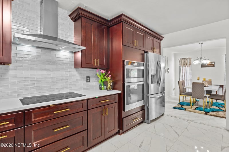 Listing details for 6005 Gumwood Dr, Jacksonville, FL 32277 : POOL HOME! SELLER WILL INSTALL A BRAND NEW ROOF WITH A FULL-PRICE OFFER OR CONTRIBUTE $10,000 TOWARD BUYER CLOSING COSTS OR SELLER CONCESSIONS. This beautifully updated home features an upgraded kitchen and remodeled bathrooms, stainless steel appliances, and new flooring throughout, along with a stylish accent wall in the main living room that adds warmth and character. The open layout creates a comfortable flow between the main living spaces, making the home ideal for everyday living and entertaining. A spacious 2-car garage adds convenience and extra storage. Step outside to your own private backyard retreat featuring an above-ground pool with a custom built-in wood deck, a covered pergola with seating area, and a fully equipped covered outdoor kitchen designed for entertaining. This impressive space includes a built-in grill, sink with running water, stone and brick base cabinetry, and generous countertops for prep and serving.