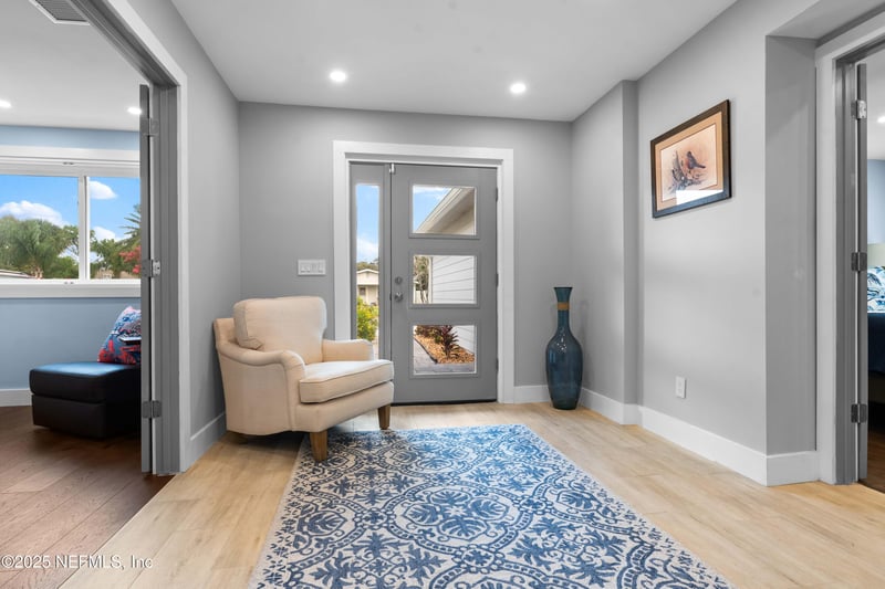 Listing details for 608 14th Ave, Jacksonville Beach, FL 32250 : 5 blocks from the Beach! High end renovation in 2024 from exterior concrete block walls in! All new high imact windows and doors. Stone front and new Hardie board siding. New high efficient HVAC, plumbing, & electrical systems. Extensive foam insulation throughout. Newly added finished garage w/recessed lighting & opener. All custom interior doors w/3sets french doors. Hand scraped hickory HD wood floors & wide plank tile floors. LED recessed lighting throughout. Primary suite features ensuite bath w/ upgraded tile, frameless glass shower, double vanity w/lighted mirror, private water closet, elegant soaking tub and full walk-in closet. Jack N Jill bath w/double vanity, oversized shower upgraded tile to ceiling & frameless glass shower. Pocket doors lead to nice sized bedrooms. Chef's kitchen features solid wood white shaker cabinets, quartz countertops & island w/pendant lighting. All new LG Stainless apps, fr dr refrigerator, range & microwave. New fencing surrounds private yard.