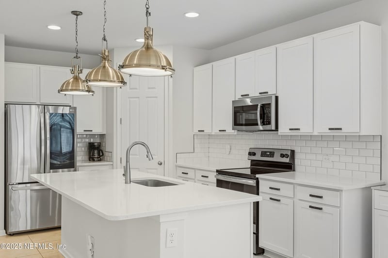 Listing details for 6363 Thatcher Ln, Jacksonville, FL 32222 : Welcome to this beautiful 4-bedroom, 2-bath home in desirable Cameron Pointe! Enjoy an open, split bedroom floor plan with tile throughout and carpet in the bedrooms. This spacious kitchen features white cabinets, quartz countertops, tile backsplash, a large island with bar seating, pantry, and stainless steel appliances. The master suite offers a spacious walk-in closet with custom organizers, dual vanities, a tiled walk-in shower, and private water closet. Guest bath includes dual vanities and a tub/shower combo. Inside laundry adds convenience. Step outside to a fully fenced backyard with a covered patio, perfect for relaxing or entertaining. With a 2-car garage and stylish finishes throughout, this move-in ready home is a must-see!
