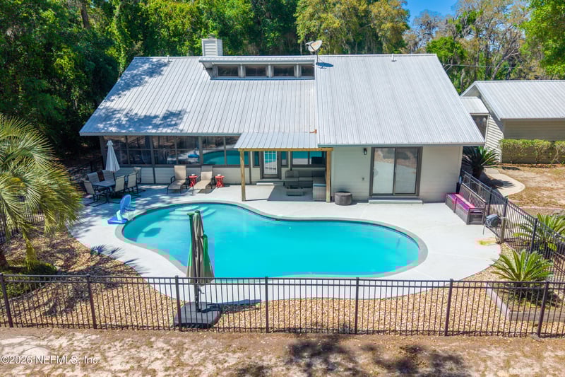 Listing details for 6519 Neale Rd, Melrose, FL 32666 : Welcome to your private slice of North Florida living where space and serenity come together on 3 beautiful acres in Melrose, Florida. This well maintained 4 bed, 2 bath home features a split floor plan with over 2100 sq ft of comfortable living space. The living room is stunning with vaulted wood ceilings, tons of natural light, and a cozy fireplace that really gives the home character. The kitchen offers wood cabinets, stainless steel appliances, and bar seating, along with a dining room. The primary suite is spacious and includes a nice bathroom with dual vanities and a tiled walk in shower. A bright sunroom overlooks the pool area, adding extra space and a great spot to relax. Step outside to enjoy the in-ground pool, renovated in 2023, with a mix of open yard and mature trees. The garage features a built-in bar, offering flexibility for a workshop, recreation space, or entertaining space. One of the BIGGEST highlights is the private access to Lily Lake. This spring fed, sandy bottom lake is known for its clear water and is ideal for boating, skiing, kayaking, and fishing. The deeded access is located at the end of the road and offers a quiet setting where you can enjoy the water and the wildlife. If you've been looking for acreage, privacy, and a pool home with character and tons of space, this one is definitely worth the look!!