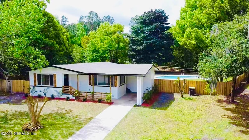 Listing details for 6678 Norde Dr, Jacksonville, FL 32244 : Gorgeous ready to move in fully renovated home with private pool. Laying on a large lot over half an acre. Offers beautiful LVP flooring through out the living space. Fully renovated tiled bathrooms. New doors and new windows. New blinds, new door handers and freshly painted. New kitchen cabinets with beautiful tiled backsplash and quartz countertops. New appliences are included. New water heater. New Ac unit. New roof. PVC plumbing done 07/22, New fixtures and faucets. Pool was resurfaced and has a new water pump serviced and inspected and its ready to be used. Double Gate 12 ft entry. Shed storage 15x10. Glass covered Florida room which can be a flex and can be used for a 4th room and add 200-300 soft to the property. Outside shower. Property comes with termite bond. no HOA no CDD. Located close to entertainment and shopping areas. This property its a must see. Motivated seller.