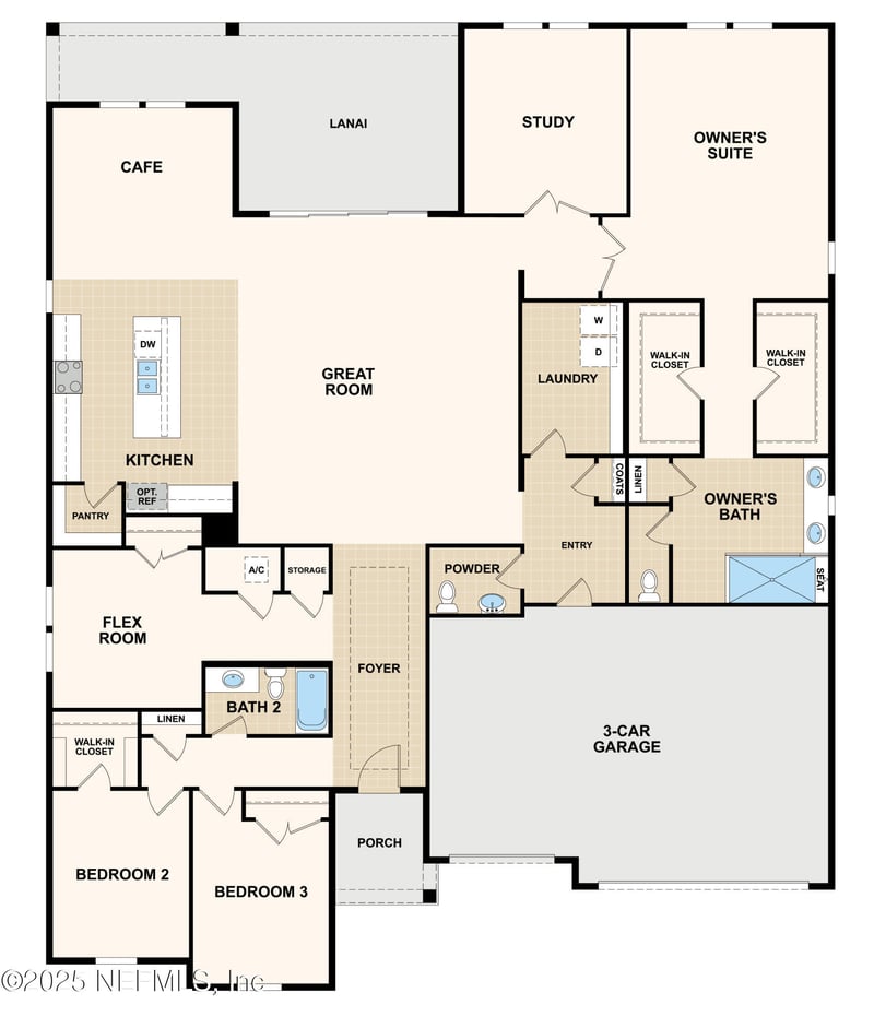 Listing details for 68 Reverie Dr, Palm Coast, FL 32137 : Ponce floor plan offers four bedrooms, a versatile flex room, and a three-car garage. The open great room flows effortlessly into the kitchen and café, creating a welcoming space for entertaining. The owner's suite, situated at the rear of the home, features a luxurious bath and dual walk-in closets for ample storage. With additional bedrooms, a study, and easy access to a spacious laundry room, the Ponce floor plan is designed for a comfortable and well-organized lifestyle.