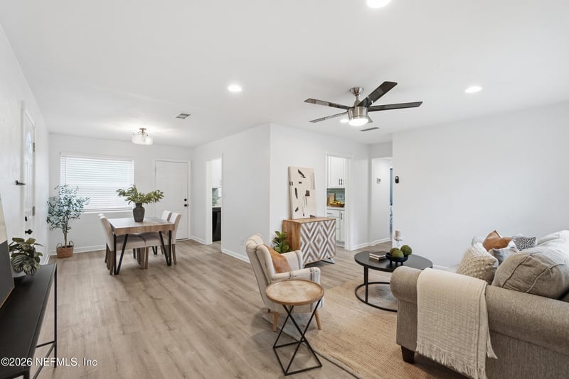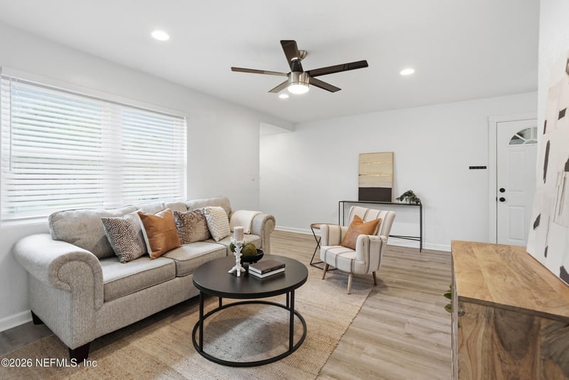 Listing details for 6821 Sans Souci Rd, Jacksonville, FL 32216 : Modern Comfort Meets Unbeatable Value! Welcome home to this stunning, fully renovated concrete block gem in the heart of Jacksonville's Southside! With 1,231 sq. ft of pristine living space and no HOA or CDD fees, this 3-bedroom home offers the perfect blend of style & freedom. Step inside to find gorgeous luxury vinyl plank flooring and designer lighting throughout. The chef-inspired kitchen is a true standout, featuring white shaker-style cabinetry to the ceiling, soft-close hardware, and elegant quartz countertops. Retreat to a brand-new bathroom boasting custom tile work and a modern vanity. Key Additional Features include Updated electrical, plumbing, and new HVAC ductwork. Bonus Space: A versatile bonus room/office with a brand-new energy-efficient Mitsubishi mini-split. Outdoors: A huge, fenced backyard--perfect for pets or weekend BBQs. Located minutes from the Town Center, Downtown, and several local parks, this move-in-ready beauty won't last. Schedule your tour today!