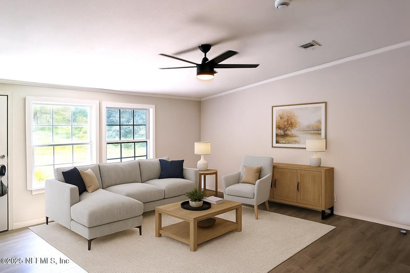 Listing details for 6928 Gilda Ct, Keystone Heights, FL 32656 : Welcome to your storybook retreat in Keystone Heights! This spacious 4BR/2BA double-wide (2,310 sq ft) rests on 5 acres of gated, partly fenced land—perfect for peaceful country living with room to roam. Recently refreshed, it boasts a brand-new roof (damaged plywood replaced),. With new gutters, plush carpet, and glowing LED lights throughout. Safety sparkles with new fire alarms in every bedroom, all tied to the whole-house system. Fresh paint, knockdown ceilings/walls, updated baths, and a refurbished kitchen with a new microwave add modern charm. Practical perks abound: new well tank, whole-house water filter, hot water heater. Also new air conditioner, and duct-work—ensuring cool comfort year-round. With every upgrade thoughtfully done, this property is move-in ready and waiting to be the next chapter of your happily-ever-after!