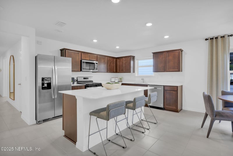Listing details for 7016 Sandperch St, Jacksonville, FL 32244 : This beautifully designed Hanover home features a welcoming Craftsman-style exterior and offers 4 Bedrooms, 2 Bathrooms, and a bright, Open-Concept layout ideal for everyday living and entertaining. The Kitchen serves as the home's focal point, showcasing Quartz Countertops, crisp White Cabinetry, a classic White Subway Tile Backsplash, and stainless-steel Whirlpool Appliances. Adjacent to the Kitchen, the inviting Café flows effortlessly into the spacious Gathering Room, where sliding glass doors lead to a Covered Lanai—perfect for outdoor meals or relaxing in the breeze. Privately positioned, the Owner's Suite provides a peaceful retreat with its expansive Walk-In closet, Dual-Sink Vanity, Walk-In Shower, and separate Water Closet. To make your move seamless, this home comes complete with our Move-In Ready Package, including Blinds, a Whirlpool Refrigerator, Washer, and Dryer—everything you need to feel at home from day one.