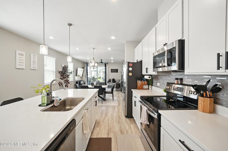Listing details for 7042 Mahogany Run Dr, Jacksonville, FL 32244 : CALLING ALL ACTIVE DUTY SERVICE MEMBERS...this home was built in 2023, so rest easy, it will pass all VA loan requirements! You will love the inviting covered front porch...once inside, this cozy 3 bedroom/2 bath home has plenty of interior features: open floorplan, impressive kitchen with quartz counters and breakfast bar, 42 inch cabinets, tile backsplash, custom light fixtures, stainless steel appliances & dining rm. The owner suite is removed from the additional 2, spacious bedrooms with private entry, double sink vanity, tile shower & private water closet. Exterior features include: 2 car garage w/220 volt car charger, covered front entry & adorable rear, screened patio...when you find yourself with a free moment and you want to spend it doing nothing!!!!