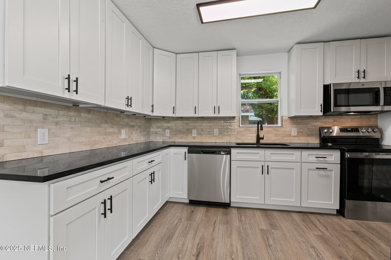 Listing details for 707 Murray Dr, Jacksonville, FL 32205 : This fully renovated bungalow in Murray Hill, Jacksonville perfectly blends modern upgrades with historic charm. Featuring three bedrooms, one bathroom, and a one-car garage, this corner-lot home is stylish, functional, and move-in ready. Step onto the inviting front porch and into a bright, open living space filled with natural light from brand-new energy-efficient windows. The open-concept floor plan flows seamlessly into the dining area and a modern kitchen with quartz countertops, shaker cabinets, stainless steel GE appliances, and a designer tile backsplash — perfect for both everyday living and entertaining. Each bedroom offers flexibility for family, guests, or a home office, while the updated bathroom features a beautifully tiled shower and modern finishes. Additional upgrades include luxury vinyl plank flooring, fresh interior and exterior paint, and a complete electrical rewire — offering both style and peace of mind. Don't miss this opportunity. Schedule your private tour today and discover why this renovated Jacksonville home is the one you've been waiting for.