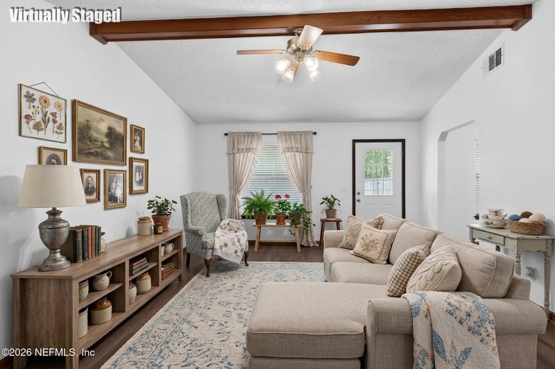 Listing details for 7149 Loves Dr, Jacksonville, FL 32222 : Move-in ready and well maintained, this 3-bedroom, 2-bath split-plan home sits on nearly half an acre, offering space and privacy. Interior features fresh paint, new LVP flooring, and new carpet in all bedrooms. The living room showcases a wood-beam vaulted ceiling, with stained wood trim and doors adding warmth and character. Ceiling fans in every bedroom. The kitchen offers ample oak cabinetry and a pantry. Major updates include a new water heater, 2019 roof, and a dependable Trane HVAC system. Exterior features low-maintenance vinyl siding with charming stone accents. Enjoy a spacious fenced backyard with shade and wooded views--ideal for relaxing or entertaining. Convenient to Oakleaf, shopping, dining, I-295, and the First Coast Expressway. NO CDD or HOA fees! Refrigerator, washer, and dryer included AS-IS.