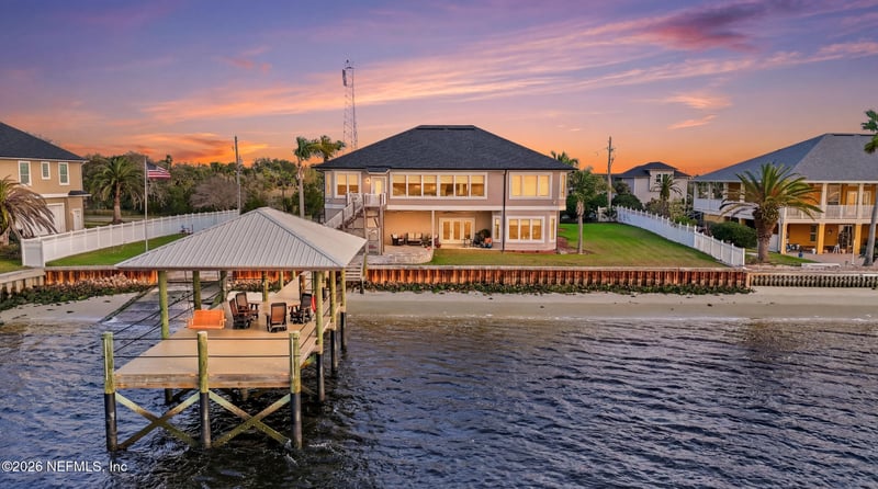 Listing details for 7156 Ramoth Dr, Jacksonville, FL 32226 : Set on over HALF AN ACRE LOT with approximately 160 FEET of direct frontage along the ST.JOHNS RIVER, this exceptional waterfront property offers expansive views and DEEP WATER ACCESS, private DOCK AND BOAT RAMP--ideal for effortless boating WITHOUT TIDAL LIMITATIONS. Tucked away in a quiet community with no HOA, the property is fenced with an automatic gate, offering a serene outdoor setting with wide-open views, coastal breezes, and a natural shoreline that reveals a SANDY BEACH AT LOW TIDE. The interior is filled with natural sunlight and thoughtfully updated for comfort and efficiency. It features a geothermal HVAC system, updated insulated ductwork, LED lighting, and Pella double-pane, Low-E, impact-rated windows. Additional interior highlights include luxury vinyl plank flooring and a newly installed 1,000 lb capacity cable elevator. The open-concept kitchen overlooks the living areas and the river, boasting updated cabinetry, quartz countertops and backsplash along with stainless steel appliances. The upper level includes three bedrooms, two bathrooms, a laundry room, and a dining area, alongside a living room with a fireplace and a dedicated sitting area where you will enjoy the water views. The lower level, accessible via stairs or elevator, features a large family room with a fireplace--perfect for entertaining--and an additional bedroom with its own sitting area and full bathroom. The property features a long driveway and a three-car garage equipped with a storage closet and a full bathroom. The lifestyle here is truly unmatched. Enjoy the breeze off the water while watching dolphins, manatees, and native birdlife. The ever-changing scenery includes passing ships traveling to and from the Jacksonville port and even views of distant rocket launches on clear nights. This property offers a rare balance of privacy and natural beauty, providing not just a home, but a distinctive waterfront lifestyle.