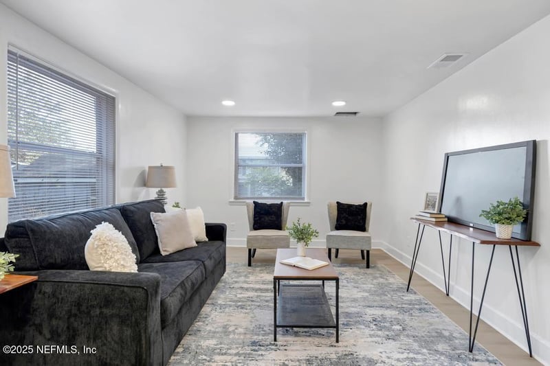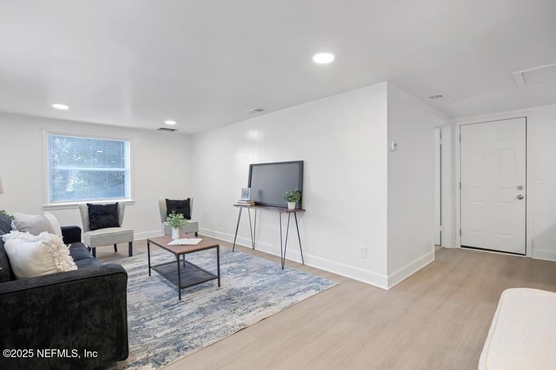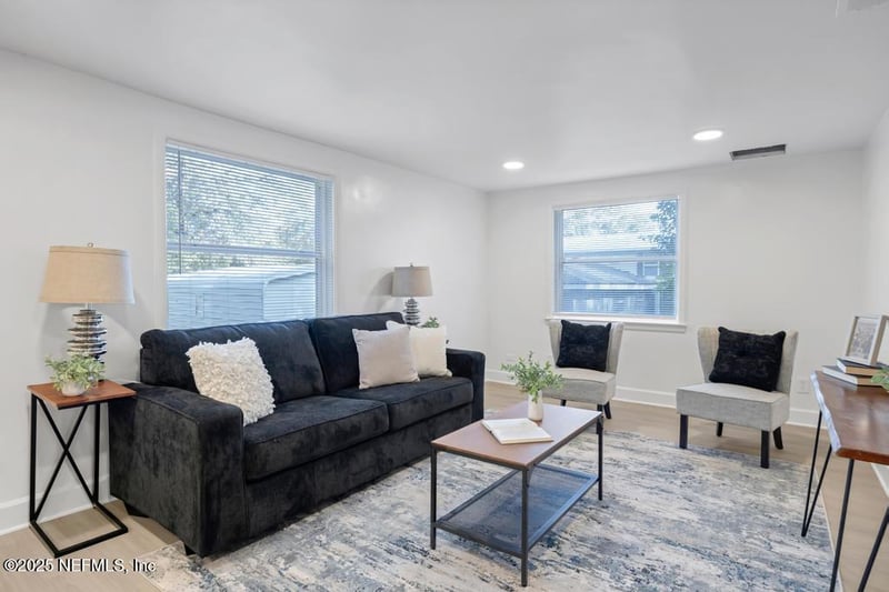 Listing details for 7412 Jasper Ave, Jacksonville, FL 32211 : Welcome to 7412 Jasper Ave, a fully renovated 2-bedroom, 1-bath single-family home offering modern updates and an open-concept layout. This move-in-ready home features luxury vinyl plank flooring, recessed lighting, and a bright, neutral color palette throughout the main living areas. The updated kitchen includes white shaker cabinetry, sleek countertops, modern hardware, and opens seamlessly to the living and dining spaces—ideal for everyday living and entertaining. Both bedrooms are well-sized with plush carpeting, ceiling fans, and ample natural light. The updated bathroom features a tub/shower combo with contemporary finishes and a modern vanity. Situated on a spacious lot (3 lots of record) with mature trees, the large backyard offers privacy and room for outdoor enjoyment or future improvements. Conveniently located near major roadways, shopping, dining, and downtown Jacksonville. Perfect for homeowners or investors alike.