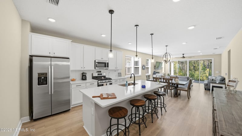 Listing details for 75565 Blackbird Dr, Yulee, FL 32097 : Welcome to this beautifully designed home offering privacy, space, and tranquil natural views, perfectly situated on a premium lot that backs to a peaceful preserve with no neighbors behind. Inside, you'll find a bright and open floor plan filled with natural light from numerous windows and an expansive sliding glass door that perfectly frames the scenic backyard. The spacious kitchen serves as the heart of the home, featuring stainless steel appliances including a gas stove, along with a large island ideal for casual dining, entertaining, or gathering with family and friends. With four generously sized bedrooms and three full bathrooms, this home provides flexibility and comfort for a variety of lifestyles, while the primary suite offers a relaxing retreat complete with dual vanities, a large walk-in shower, and a walk-in closet. Durable luxury vinyl plank flooring runs throughout the main living areas, with cozy carpeting in the bedrooms for added comfort. Located in Wildlight, residents enjoy access to exceptional amenities including a resort-style pool, tennis and pickleball courts, a spacious playground, and a welcoming clubhouse, making this home a perfect blend of modern living and natural beauty. All information pertaining to the property is deemed reliable, but not guaranteed. Information to be verified by the Buyer. Be advised that cameras may exist recording audio and video inside/outside the property, such as ring doorbells. Photos are digitally enhanced and could be altered, please verify.