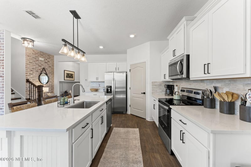 Listing details for 75754 Egret Landing Ct, Yulee, FL 32097 : There isn't a single part of this home that hasn't been thoughtfully improved. From the covered and screened patio to the expanded paver patio, updated flooring, paint, mirrors, light fixtures, feature walls, and upgraded quartz countertops — the list truly goes on. This home feels easy from the moment you walk in. The kitchen is the kind of space where mornings happen naturally, with quartz counters, a marble backsplash, and a custom pantry that keeps everyday chaos in check. Feature walls and updated lighting add personality without overpowering the space, and the downstairs flows comfortably for real life, not just showings. Upstairs offers space to spread out and unwind, while a flexible room downstairs adapts easily for guests, work, or whatever season you're in. Out back, a tiled screened and covered patio with extended pavers creates the perfect spot for gathering, grilling, or quiet evenings at home. This is a home that's been cared for — and it shows.