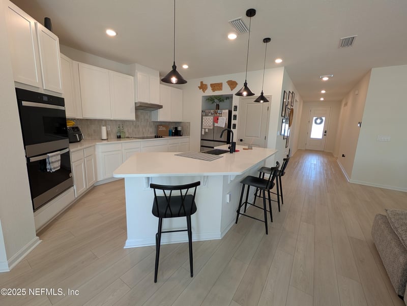 Listing details for 7740 Dunhill Ct, Jacksonville, FL 32222 : NEARLY NEW FOUR BEDROOM HOME IN A CUL-DE-SAC WITH QUICK ACCESS TO FIRST COAST EXPRESSWAY, OAKLEAF TOWN CENTER & EAGLE LANDING GOLF CLUB! Inside you will find LVP through the living and kitchen spaces, wide open kitchen w/ 42'' shaker cabinetry, open bar with quartz counters, stainless appliances. This split bedroom style plan provides for an over-sized owner's suite in the private back corner w/ ample walk-in closet space. The backyard is capacious w/ plenty of space for your pups! Community pool and green space are nearby.