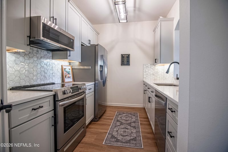 Listing details for 7990 Baymeadows Rd #823, Jacksonville, FL 32256 : No expense was spared in creating total luxury and style in this 3 BR/2 full bath home, with newly replaced windows ($7K), HVAC ($7K), luxury vinyl plank (scratch resistant) flooring, bathroom renovations and complete kitchen renovation including custom cabinetry, quartz countertops, backsplash, hardware, RO water system, lighting and appliances. 9 foot ceilings and crown moldings add to the bright, relaxing living space. Enjoy the split bedroom design off the open-concept living space for aesthetic and functional flexibility. Within the primary suite haven, the seller has generously added a cabinet with quartz countertop in the master walk-in closet located next to the private primary bath. This unit was chosen by the seller because it offered the tranquillity from facing the lake and the privacy and convenience of being on the second floor along with being close to the high-end shopping at St Johns Town Center. The private screened-in balcony overlooking the lake with the sound of the fountain will remind you to exhale and relax each day. Your location in this home offers you most convenient access within the Jacksonville area, just named the Number One city for First Time Homebuyers! Close to health facilities, dining, shopping, commuting routes/ route 295, airport, and endless recreation... including Top Golf just minutes away. HOA fees include water, trash, maintenance and use of amenities such as pool, clubhouse, fitness center, car wash area and walking paths.