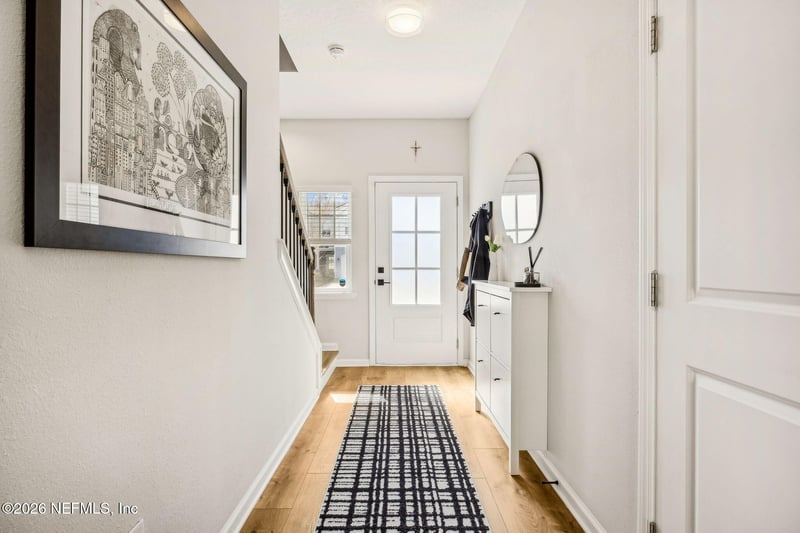 Listing details for 85 Pinebury Ln, St Augustine, FL 32092 : End-unit townhome with extensive upgrades and no carpet anywhere. This move-in-ready home features continuous luxury vinyl plank flooring throughout the main level, stairs, and second floor, creating a clean, modern look that stands apart from other offerings in the community. The end-unit location provides additional windows and natural light, enhancing the open layout that flows seamlessly from the kitchen to the dining and living areas, plus a convenient half bath on the main level. Upstairs, all bedrooms and the laundry room are thoughtfully located on one level for everyday convenience. The primary suite includes a private bath with a large glass-enclosed shower and walk-in closet. Secondary bedrooms share a full bath, offering flexibility for guests, work-from-home space, or everyday living. Additional highlights include an epoxy-coated single-car garage, updated finishes, and a low-maintenance layout ideal for a lock-and-leave lifestyle. Located in Holly Forest at Silverleaf with access to neighborhood and resort-style amenities, miles of walking paths, and close proximity to shopping, dining, and major commuter routes.