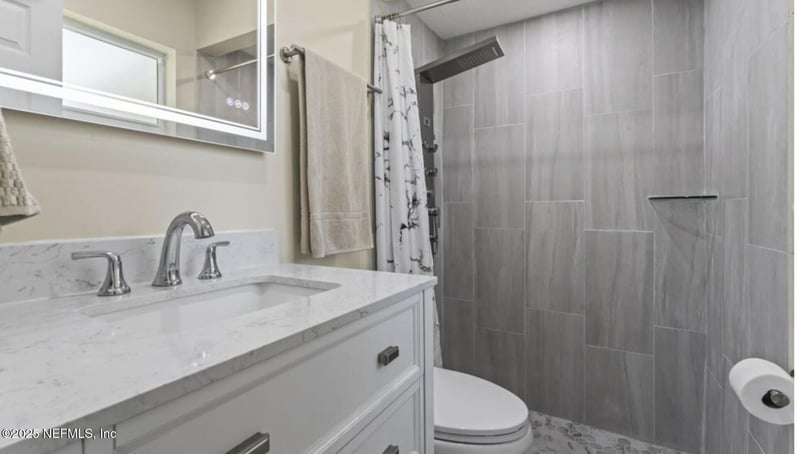 Listing details for 858 Trinidad Rd, Jacksonville, FL 32216 : Modern Luxury in Holiday Hill,Fully renovated home in the Holiday Hill where contemporary style & thoughtful design converge. This stunning 4/2home is more than move-in ready, it's a showcase of modern living. A flexible floor plan offers both a formal living room and a comfortable family room, ideal for entertaining or relaxing. The fourth bedroom is perfectly positioned for an executive office or private in-law suite, complete with its own separate entrance. Step into a chef's dream kitchen featuring a striking cobalt blue backsplash, sleek soft-close cabinetry, butcher block waterfall-edge breakfast bar, & high-end appliances including an induction cooktop with convection oven and air fryer. The pot filler and modern refrigerator with round ice cube dispenser add touches of true culinary luxury. Bathrooms have been upgraded w/ lighted mirrors & high end shower fixtures, indoor laundry w/ sink . spacious, fully fenced yard adorned with party lights. NEW ROOF.