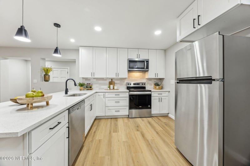 Listing details for 9019 Greenleaf Rd, Jacksonville, FL 32208 : Welcome home to this beautifully fully remodeled 4-bedroom, 2-bath home offering modern comfort and style. Thoughtfully updated from top to bottom, this home features a brand-new roof, new HVAC system, new water heater, and energy-efficient windows for peace of mind and long-term savings. The stunning kitchen showcases all-new cabinetry, quartz countertops, and brand-new appliances, flowing seamlessly into the main living areas adorned with luxury vinyl plank flooring throughout. Both bathrooms have been upgraded with elegant luxury tile finishes, creating a spa-like feel. Situated on a generous .28-acre lot, the property offers a fully fenced backyard—perfect for outdoor entertaining, pets, or play. With no detail overlooked, this move-in-ready home combines modern upgrades with ample space inside and out. Conveniently located near shopping, dining, and major roadways—this one is a must-see!