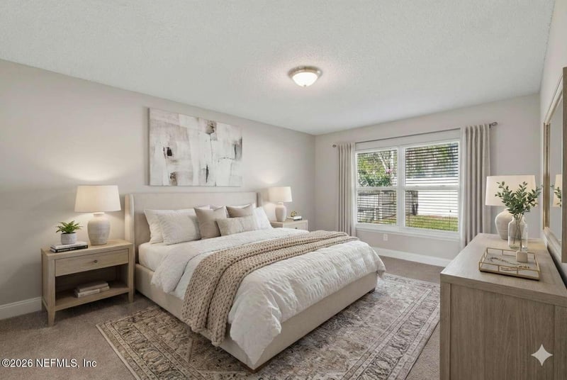 Listing details for 9051 Prosperity Lake Dr, Jacksonville, FL 32244 : One or more photo(s) have been virtually staged. Welcome home to this beautifully designed 3-bedroom, 1.5-bathroom residence offering designed finishes and a warm, inviting layout. The spacious kitchen is a standout, featuring sleek stainless steel appliances, stylish cabinetry, and a convenient breakfast bar that opens to the living and dining areas—perfect for everyday living and entertaining. The primary bedroom provides a relaxing retreat with a walk-in closet and a private ensuite bathroom complete with a separate tub, shower, and double vanities. Additional bedrooms offer flexibility for guests, or a home office. A dedicated laundry area adds everyday convenience. Step outside to enjoy a large, fully fenced backyard—ideal for pets, play, or outdoor gatherings—while the screened-in porch offers a peaceful space to unwind. A double garage provides ample room for vehicles and storage. This home truly checks all the boxes—plan your tour today!