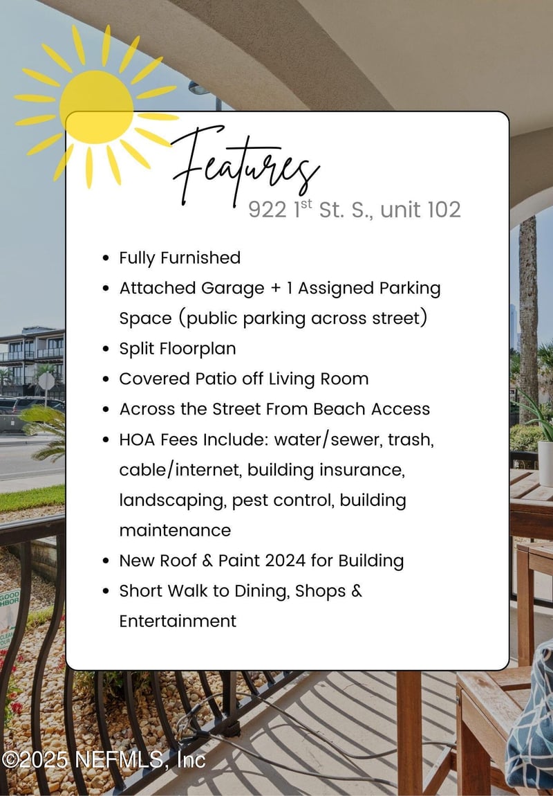 Listing details for 922 1st St #102, Jacksonville Beach, FL 32250 : Coastal living made easy now under $600K! Here's your opportunity to own a rare ground-floor condo with an attached garage (+one designated parking space!) just steps from the sand and surf. Thoughtfully designed with modern coastal finishes, plantation shutters throughout, and offered fully furnished, this 2 bed/2 bath, split floor plan is ready for next owner. The spacious primary features a walk-in closet, en-suite bath, and step-in shower, while the guest bedroom offers a relaxing retreat for visitors. Step out from the living area onto your private patio overlooking vibrant 1st St, the perfect spot to sip your morning coffee and enjoy the ocean breeze. Located in a boutique 8-unit community, you'll love the quiet coastal vibe while staying within walking distance of local restaurants, shops, and entertainment. With a 30-day rental restriction, this property is ideal as a personal getaway that can also generate income when you're away.